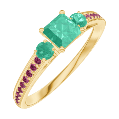« L'ATELIER » Nº161990Ring Geelgoud 9 karaat - Smaragd Prinses 0.3 Karaat - Aanleunende edelstenen Smaragd - Setting Robijn