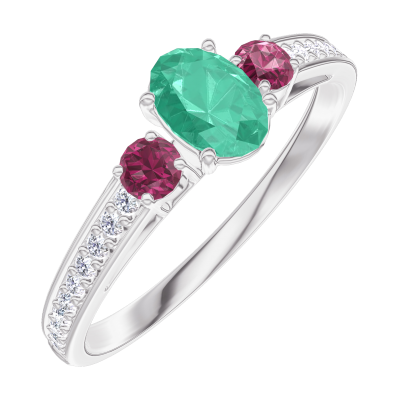 « L'ATELIER » Nº162148Ring Witgoud 9 karaat - Smaragd Ovaal 0.3 Karaat - Aanleunende edelstenen Robijn - Setting Diamant 5
