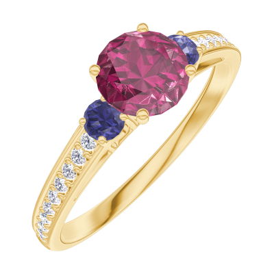 « L'ATELIER » Nº163066Ring Geelgoud 9 karaat - Robijn rond 0.5 Karaat - Aanleunende edelstenen Blauwe saffier - Setting Diamant 4.9