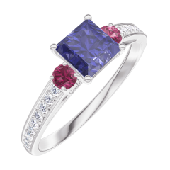 « L'ATELIER » NR. 163747Ring Witgoud 18 karaat - Blauwe saffier Prinses 0.5 Karaat - Aanleunende edelstenen Robijn - Setting Diamant