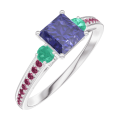 « L'ATELIER » NR. 163792Ring Witgoud 9 karaat - Blauwe saffier Prinses 0.5 Karaat - Aanleunende edelstenen Smaragd - Setting Robijn