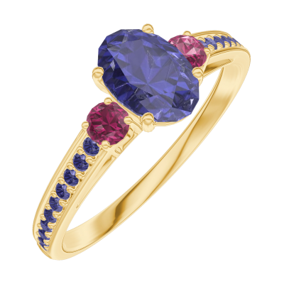 « L'ATELIER » Nº163954Ring Geelgoud 9 karaat - Blauwe saffier Ovaal 0.5 Karaat - Aanleunende edelstenen Robijn - Setting Blauwe saffier