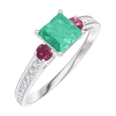 « L'ATELIER » Nº164347Ring Witgoud 18 karaat - Smaragd Prinses 0.5 Karaat - Aanleunende edelstenen Robijn - Setting Diamant