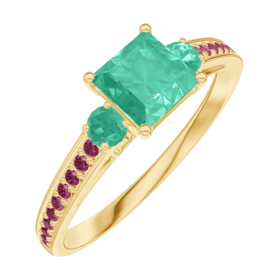 « L'ATELIER » NR. 164390Ring Geelgoud 9 karaat - Smaragd Prinses 0.5 Karaat - Aanleunende edelstenen Smaragd - Setting Robijn
