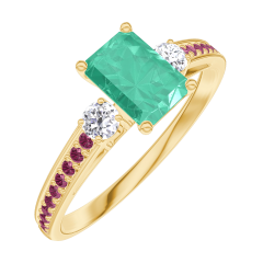 « L'ATELIER » NR. 164430Ring Geelgoud 9 karaat - Smaragd Rechthoekig 0.5 Karaat - Aanleunende edelstenen Diamant - Setting Robijn