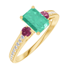Ring Geelgoud 18 karaat - Smaragd Rechthoekig 0.5 Karaat - Aanleunende edelstenen Robijn - Setting Diamant