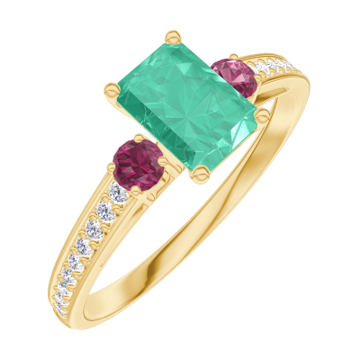 « L'ATELIER » NR. 164446Ring Geelgoud 9 karaat - Smaragd Rechthoekig 0.5 Karaat - Aanleunende edelstenen Robijn - Setting Diamant