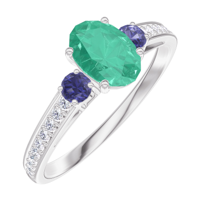 « L'ATELIER » Nº164567Ring Witgoud 18 karaat - Smaragd Ovaal 0.5 Karaat - Aanleunende edelstenen Blauwe saffier - Setting Diamant