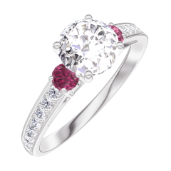 Ring Witgoud 9 karaat - Diamant rond 0.7 Karaat - Aanleunende edelstenen Robijn - Setting Diamant
