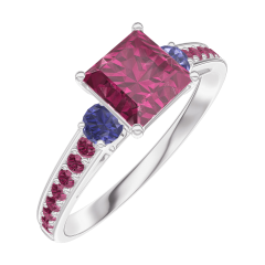 « L'ATELIER » NR. 165572Ring Witgoud 9 karaat - Robijn Prinses 0.7 Karaat - Aanleunende edelstenen Blauwe saffier - Setting Robijn