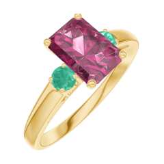 Ring Geelgoud 18 karaat - Robijn Rechthoekig 0.7 Karaat - Aanleunende edelstenen Smaragd