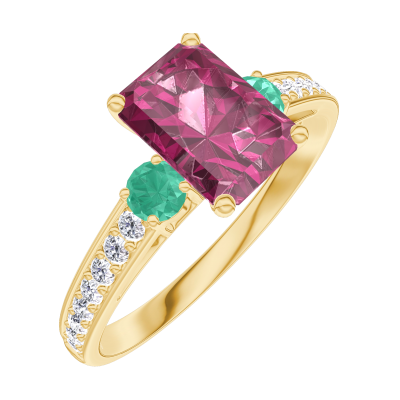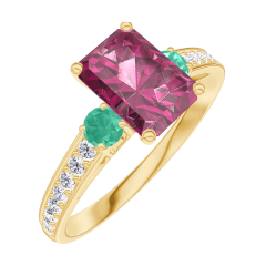 « L'ATELIER » NR. 165686Ring Geelgoud 9 karaat - Robijn Rechthoekig 0.7 Karaat - Aanleunende edelstenen Smaragd - Setting Diamant
