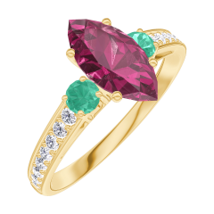 « L'ATELIER » NR. 165986Ring Geelgoud 9 karaat - Robijn Markies 0.7 Karaat - Aanleunende edelstenen Smaragd - Setting Diamant