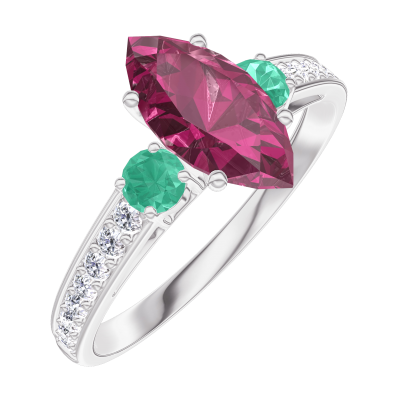 « L'ATELIER » Nº165988Ring Witgoud 9 karaat - Robijn Markies 0.7 Karaat - Aanleunende edelstenen Smaragd - Setting Diamant