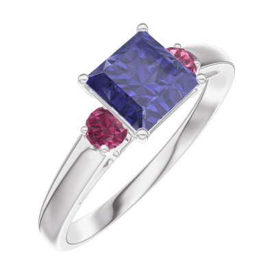 « L'ATELIER » Nº166144Ring Witgoud 9 karaat - Blauwe saffier Prinses 0.7 Karaat - Aanleunende edelstenen Robijn