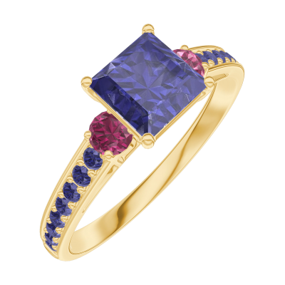 « L'ATELIER » Nº166153Ring Geelgoud 18 karaat - Blauwe saffier Prinses 0.7 Karaat - Aanleunende edelstenen Robijn - Setting Blauwe saffier