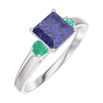 « L'ATELIER » Nº166184Ring Witgoud 9 karaat - Blauwe saffier Prinses 0.7 Karaat - Aanleunende edelstenen Smaragd