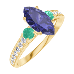 « L'ATELIER » NR. 166586Ring Geelgoud 9 karaat - Blauwe saffier Markies 0.7 Karaat - Aanleunende edelstenen Smaragd - Setting Diamant