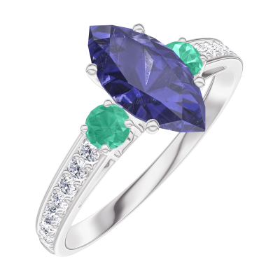 « L'ATELIER » NR. 166588Ring Witgoud 9 karaat - Blauwe saffier Markies 0.7 Karaat - Aanleunende edelstenen Smaragd - Setting Diamant