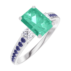 Ring Witgoud 18 karaat - Smaragd Rechthoekig 0.7 Karaat - Aanleunende edelstenen Diamant - Setting Blauwe saffier