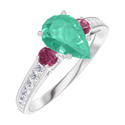 « L'ATELIER » Nº167048Ring Witgoud 9 karaat - Smaragd Peer 0.7 Karaat - Aanleunende edelstenen Robijn - Setting Diamant