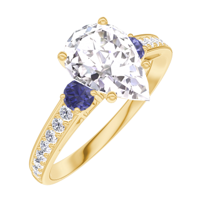 « L'ATELIER » Nº167666Ring Geelgoud 9 karaat - Diamant Peer 1 Karaat - Aanleunende edelstenen Blauwe saffier - Setting Diamant
