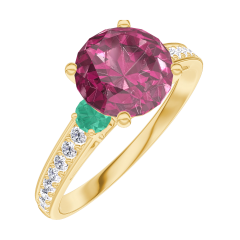 Ring Geelgoud 18 karaat - Robijn rond 1 Karaat - Aanleunende edelstenen Smaragd - Setting Diamant