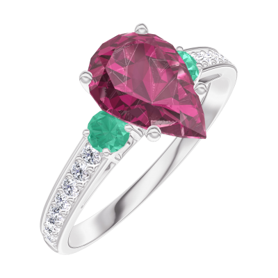 « L'ATELIER » Nº168288Ring Witgoud 9 karaat - Robijn Peer 1 Karaat - Aanleunende edelstenen Smaragd - Setting Diamant