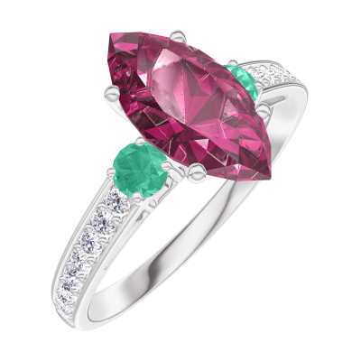 « L'ATELIER » Nº168387Ring Witgoud 18 karaat - Robijn Markies 1 Karaat - Aanleunende edelstenen Smaragd - Setting Diamant