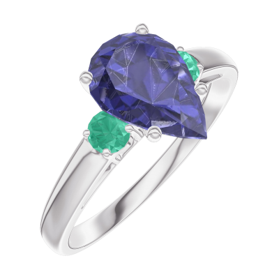 « L'ATELIER » Nº168884Ring Witgoud 9 karaat - Blauwe saffier Peer 1 Karaat - Aanleunende edelstenen Smaragd