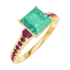 Ring Geelgoud 18 karaat - Smaragd Prinses 1 Karaat - Aanleunende edelstenen Robijn - Setting Robijn
