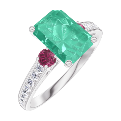 « L'ATELIER » Nº169248Ring Witgoud 9 karaat - Smaragd Rechthoekig 1 Karaat - Aanleunende edelstenen Robijn - Setting Diamant 4.6 (5)