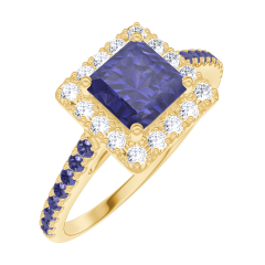 « L'ATELIER » NR. 170638Ring Geelgoud 9 karaat - Blauwe saffier Prinses 0.5 Karaat - Halo Diamant - Setting Blauwe saffier 4.6