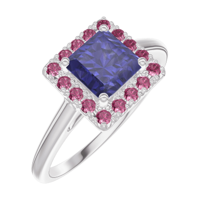 « L'ATELIER » Nº170643Ring Witgoud 18 karaat - Blauwe saffier Prinses 0.5 Karaat - Halo Robijn 4.6