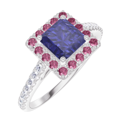 Ring Witgoud 18 karaat - Blauwe saffier Prinses 0.5 Karaat - Halo Robijn - Setting Diamant