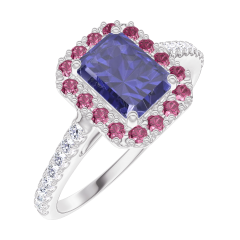 « L'ATELIER » NR. 170696Ring Witgoud 9 karaat - Blauwe saffier Rechthoekig 0.5 Karaat - Halo Robijn - Setting Diamant 4.9