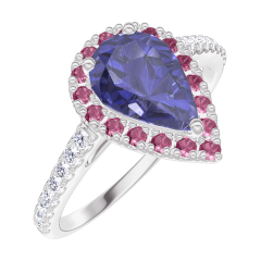 « L'ATELIER » NR. 170792Ring Witgoud 9 karaat - Blauwe saffier Peer 0.5 Karaat - Halo Robijn - Setting Diamant 5
