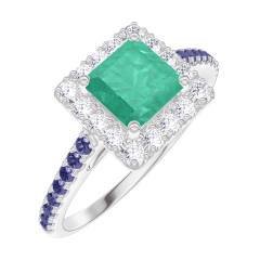 Ring Witgoud 9 karaat - Smaragd Prinses 0.5 Karaat - Halo Diamant - Setting Blauwe saffier
