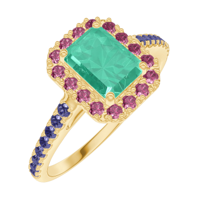 « L'ATELIER » NR. 170989Ring Geelgoud 18 karaat - Smaragd Rechthoekig 0.5 Karaat - Halo Robijn - Setting Blauwe saffier 4.9