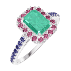 « L'ATELIER » NR. 170991Ring Witgoud 18 karaat - Smaragd Rechthoekig 0.5 Karaat - Halo Robijn - Setting Blauwe saffier 4.9