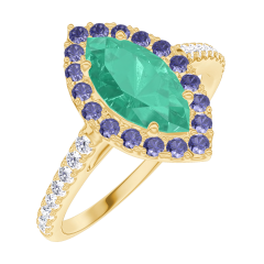 Ring Geelgoud 18 karaat - Smaragd Markies 0.5 Karaat - Halo Blauwe saffier - Setting Diamant