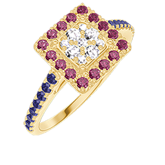 « L'ATELIER » NR. 211478Ring Geelgoud 9 karaat - Cluster van natuurlijke diamantent Prinses gelijkwaardig 0.5 - Halo Robijn - Setting Blauwe saffier 4.6