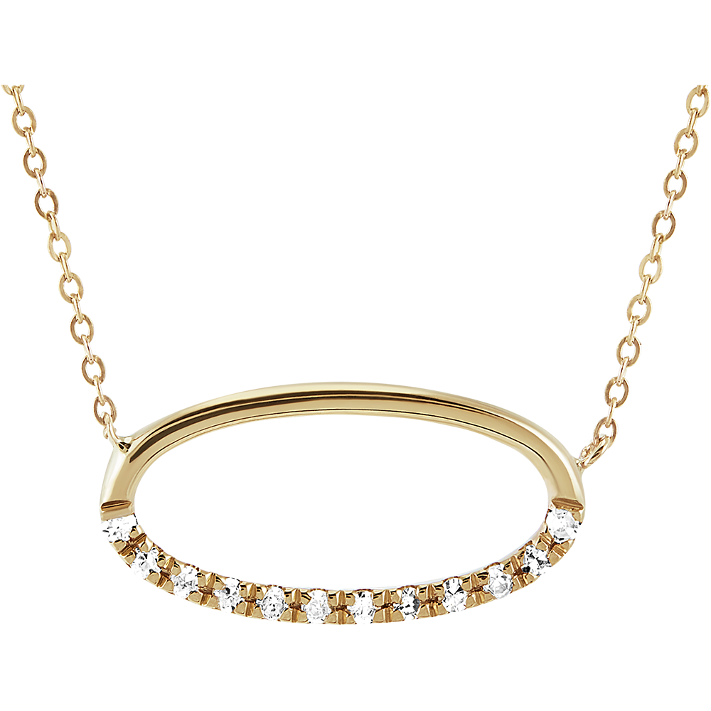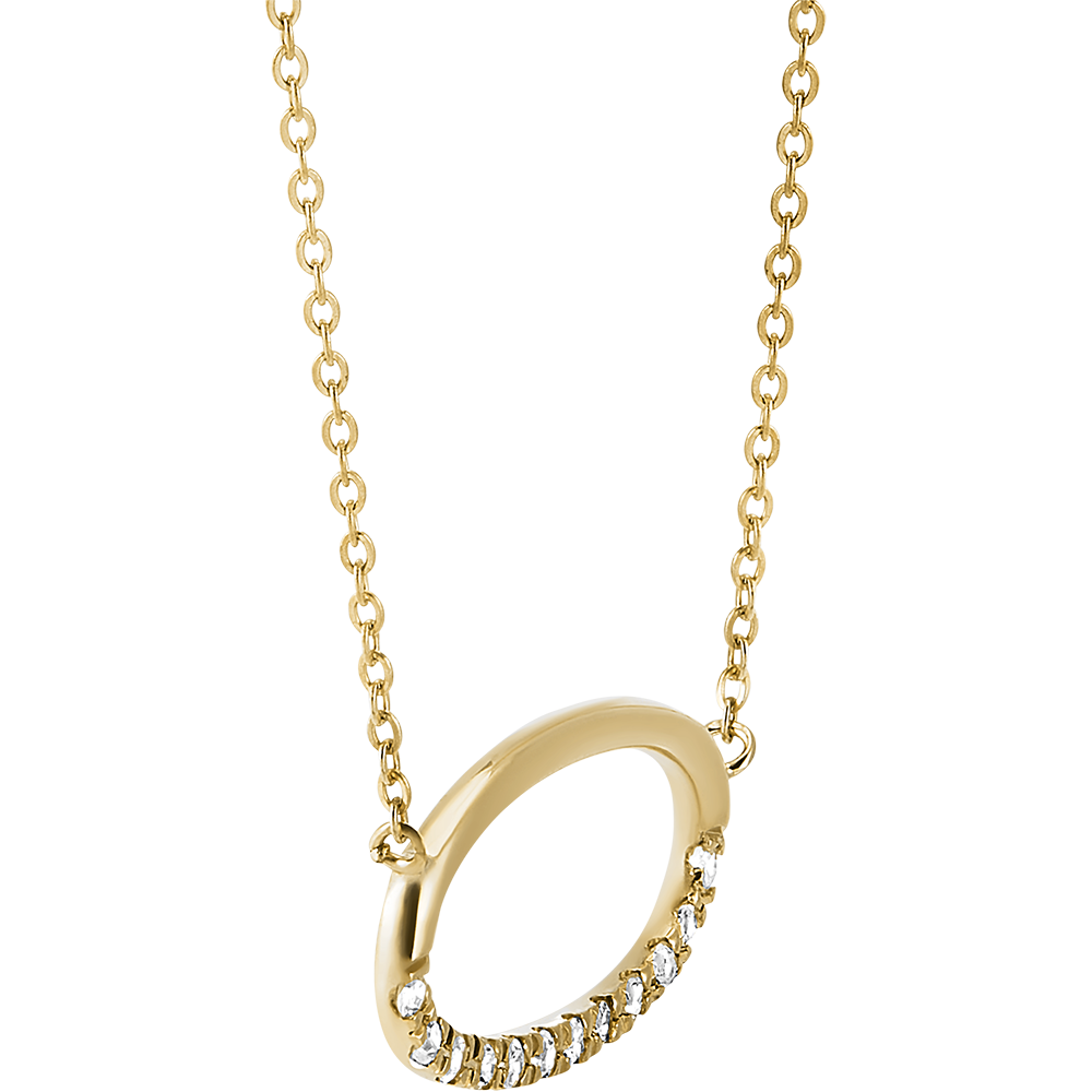 Een ovale gouden hanger waarvan de helft zorgvuldig met diamanten is bezet en gemonteerd op een geelgouden ketting. Een puur model, dicht bij de elementen en emoties.