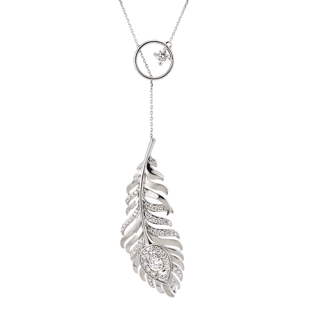 De Sautoir-ketting is ontworpen in 9 karaats witgoud, versierd met 50 synthetische diamanten die de veervormige hanger accentueren. Met een ketting van 45 cm en een verfijnd ontwerp geeft deze ketting een majestueuze uitstraling die perfect het spectaculaire karakter van de Panache collectie weerspiegelt.