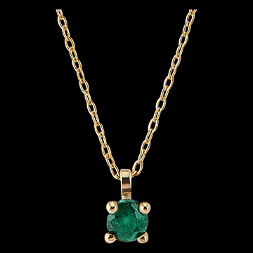 De waardering en de essentie van een smaragd sober gedragen aan een geelgouden ketting. Een klassiek, tijdloos sieraad met een vleugje kleur.