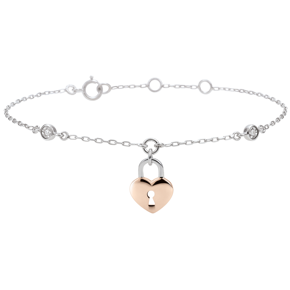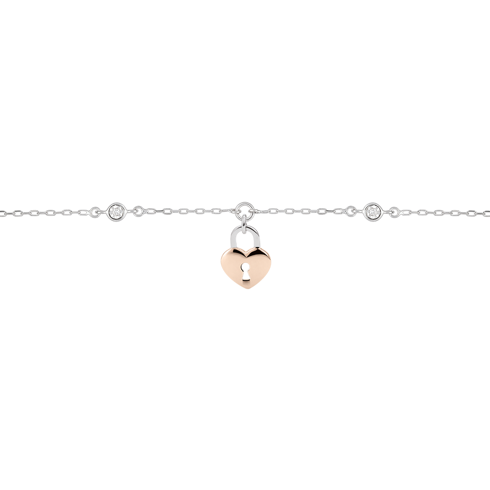 Een hartslotje in roségoud op een witgouden ketting gezet met twee diamanten. Armband met verstelbare lengte: 18cm, 17cm, 16cm. Motief van 8mm lengte en 11 mm hoogte.