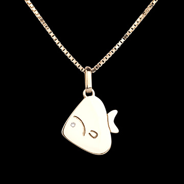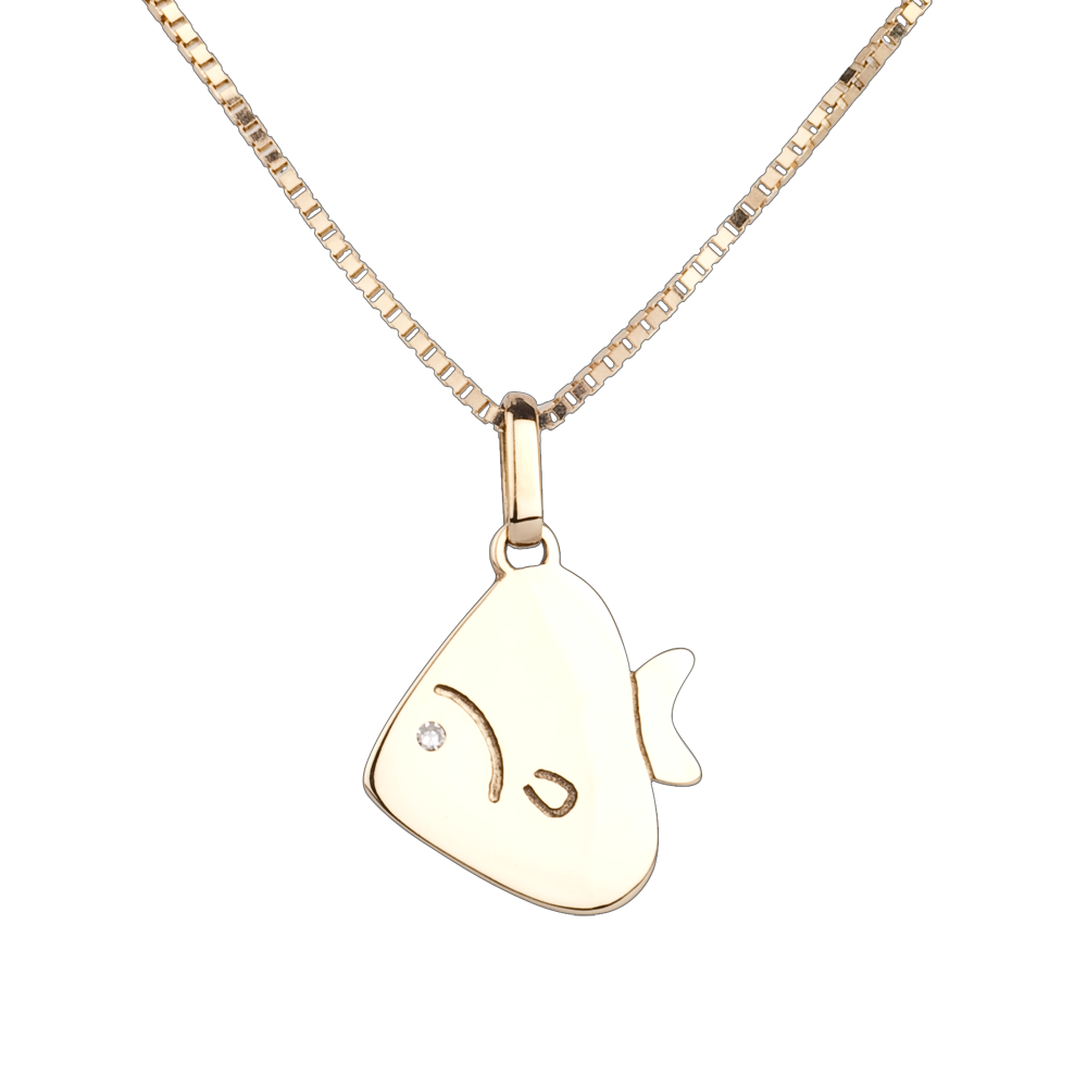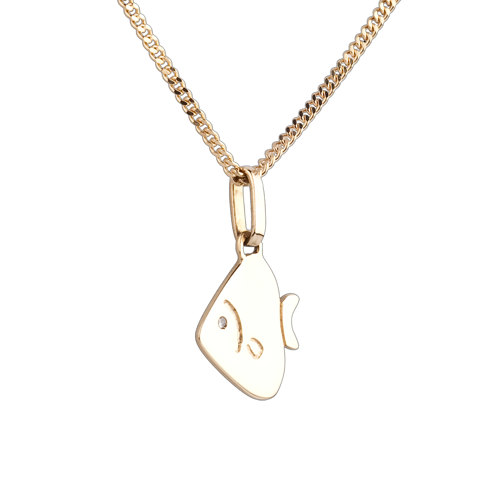Een kleine ronde en zachte vis. In geelgoud en met een diamanten oog. Groot model.