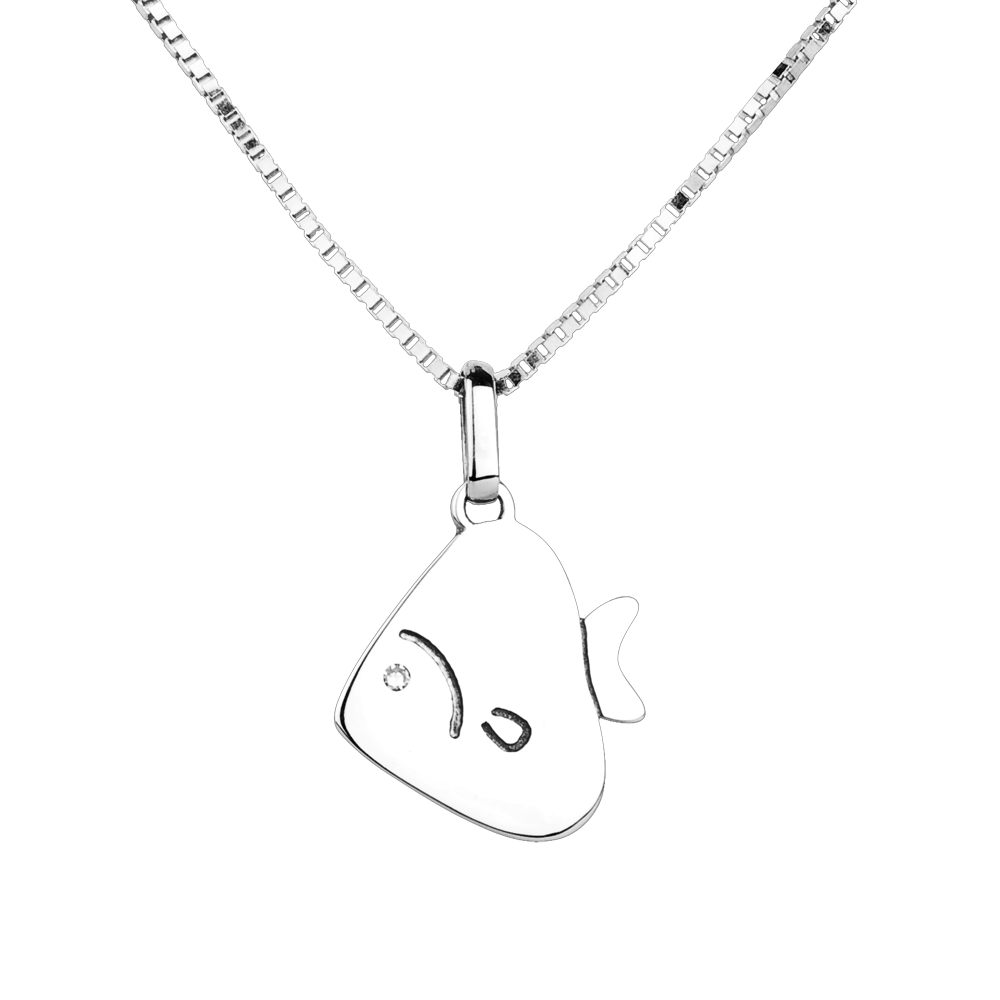 Een kleine ronde en zachte vis. In witgoud en met een diamanten oog. Groot model.