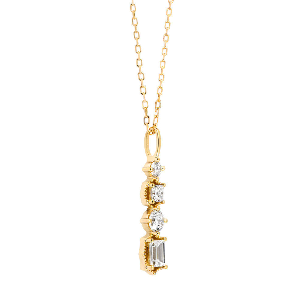 Vier sprankelende diamanten zijn uitgelijnd in een verfijnd spel van maten en reflecties.Een delicate en verfijnde hanger die het licht harmonieus en eigentijds vangt.
