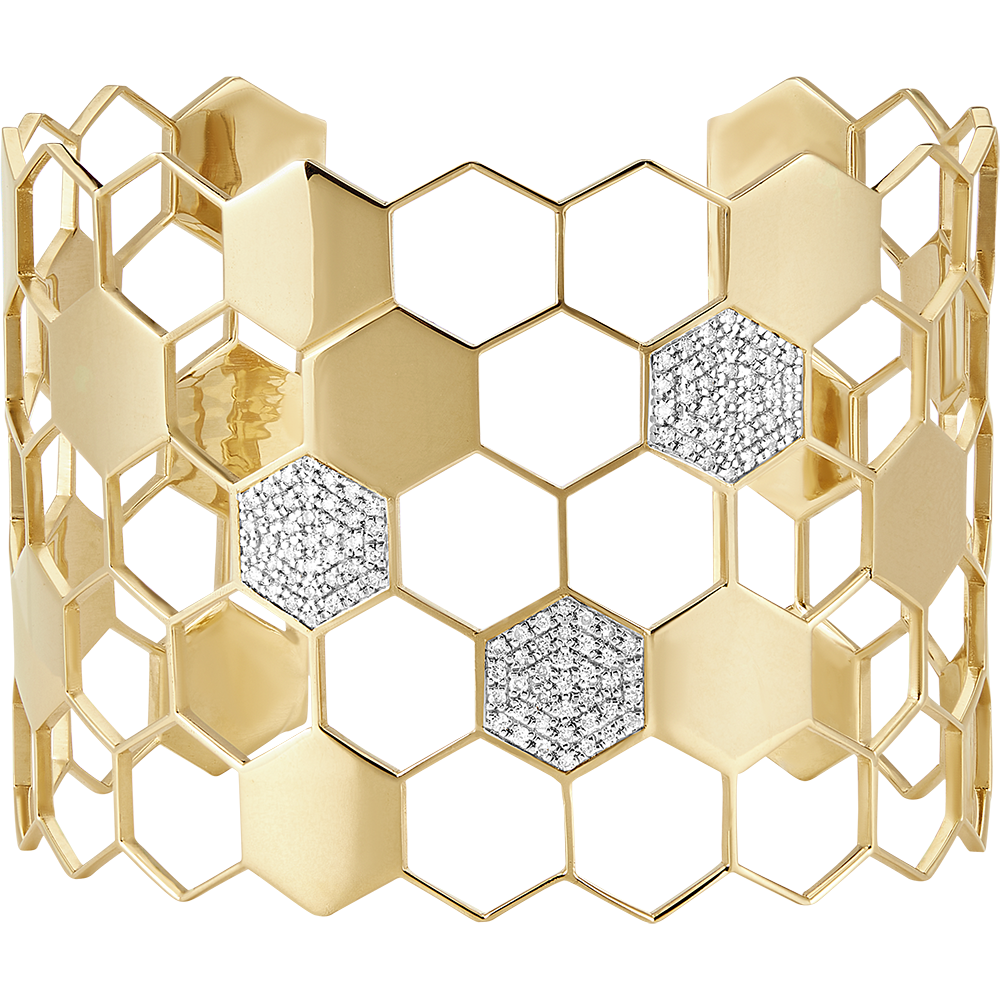 Deze majestueuze manchetarmband is geïnspireerd door het kostbare werk van bijen. Het bestaat uit vijf rijen uitgeholde gouden honingraatcellen. 20 volle cellen verrijken het sieraad en 3 cellen zijn bezet met 111 diamanten en brengen een vleugje licht en elegantie naar het geheel.